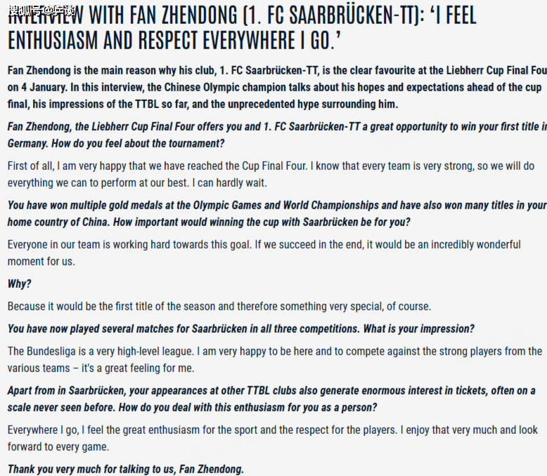 第2个问题:德甲发问:在你的职业生涯里,曾经多次在世乒赛、奥运会这种世界级的舞台上登顶,夺得金牌,同时你也在中国国内的比赛中赢得过诸多冠军。在德国,与萨尔布吕肯俱乐部和你的队友们一起冲击杯赛冠军,这对你来说有何意义,有多重要?
